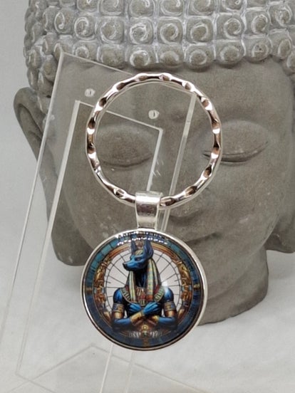 Porte-clés représentant le Dieu Anubis dans un cabochon en verre.