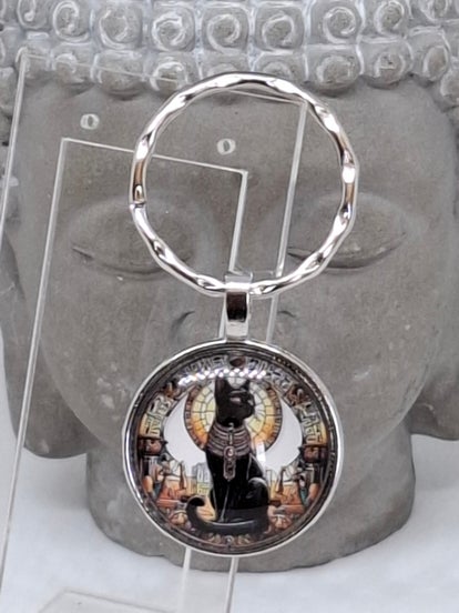 Porte-clés représentant le Chat noir égyptien dans un cabochon en verre.