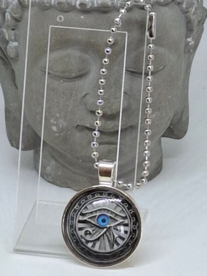 Porte-clés représentant l'Oeil d'Horus, une amulette égyptienne ancienne, dans un cabochon en verre.