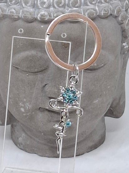 Porte-clés représentant un superbe flocon de neige en cristal bleu accompagné de cristal blanc et une écriture : Faith (foi).