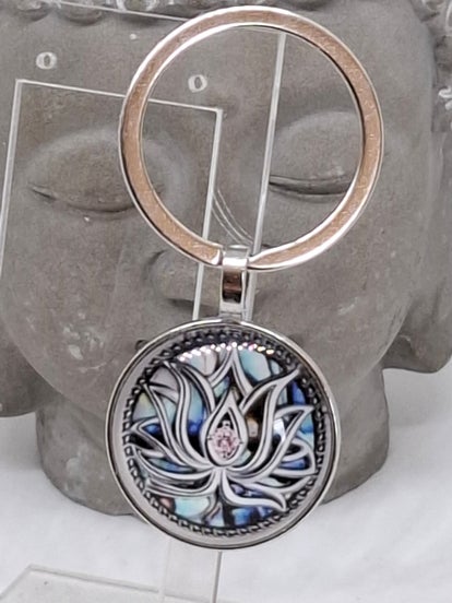 Porte-clés représentant un superbe lotus dans un cabochon en verre avec de magnifiques détails.