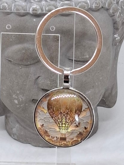 Porte-clés inspiré de l'aventure, représentant une superbe montgolfière dans un cabochon en verre avec de magnifiques détails.