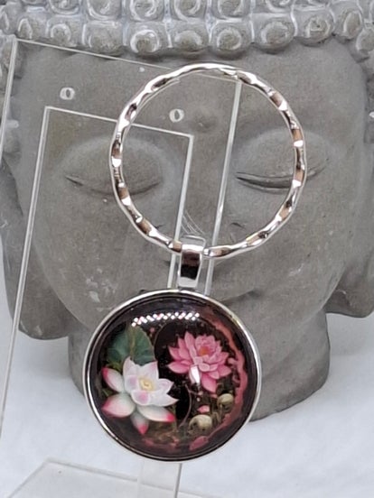 Porte-clés inspiré du bouddhisme, représentant deux superbes fleurs de lotus dans un cabochon en verre avec de magnifiques détails.