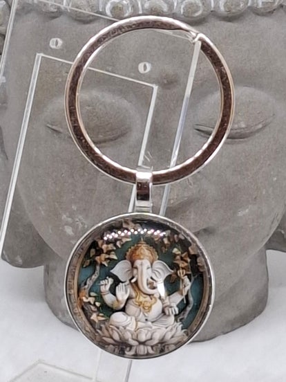 Porte-clés inspiré de l'Hindouisme, représentant Ganesha ou appelé aussi Ganesh, à la tête d'éléphant, Dieu Hindou patron de la richesse et l'intelligence dans un cabochon en verre.