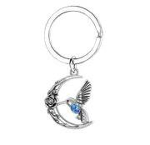 Porte-clés représentant une superbe lune avec un détail d'une rose splendide et un colibri avec des gemmes blanc et bleu.