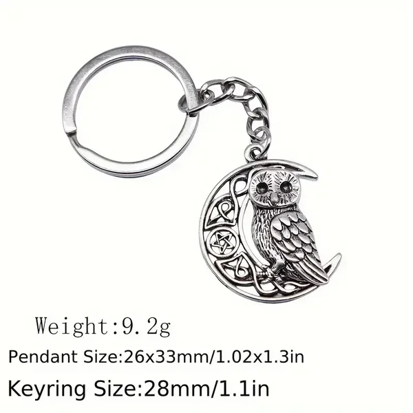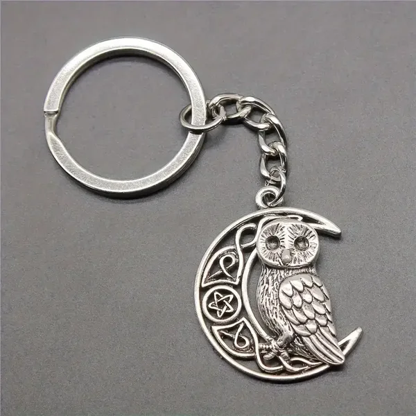 Porte-clés représentant une superbe lune avec des détails de symbole sur laquelle un hibou est posé.