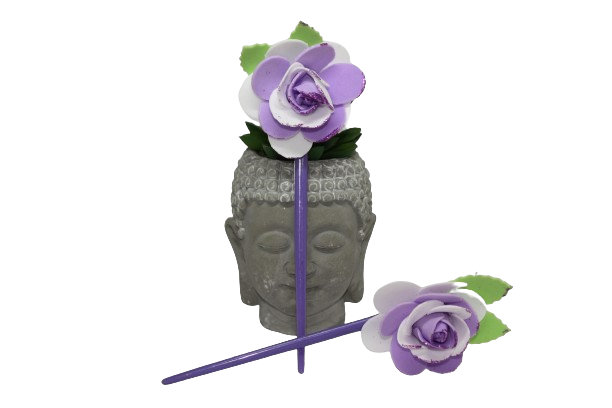 Plantez les bâtons dans des chinions pour un style japonais ou chinois, sympa dans les cheveux avec une rose, environ 5 cm lilas et blanche avec paillettes sur quelques bouts de pétales et 2 feuilles verte en mousseline.