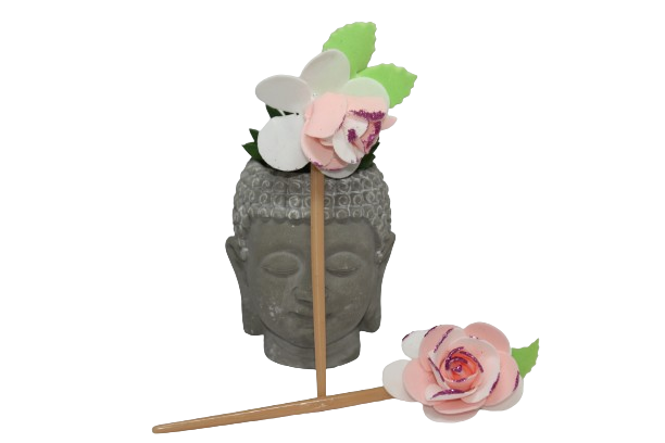 Plantez les bâtons dans des chinions pour un style japonais ou chinois, sympa dans les cheveux avec une rose, environ 5 cm rose très claire et blanche avec paillettes sur quelques bouts de pétales et 2 feuilles verte en mousseline.